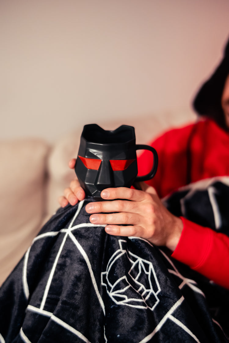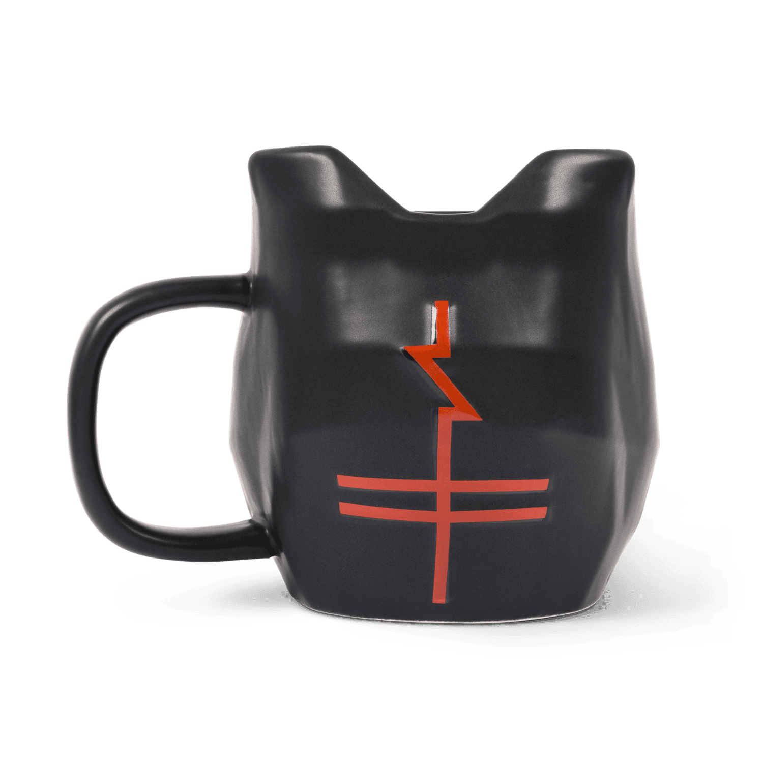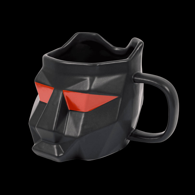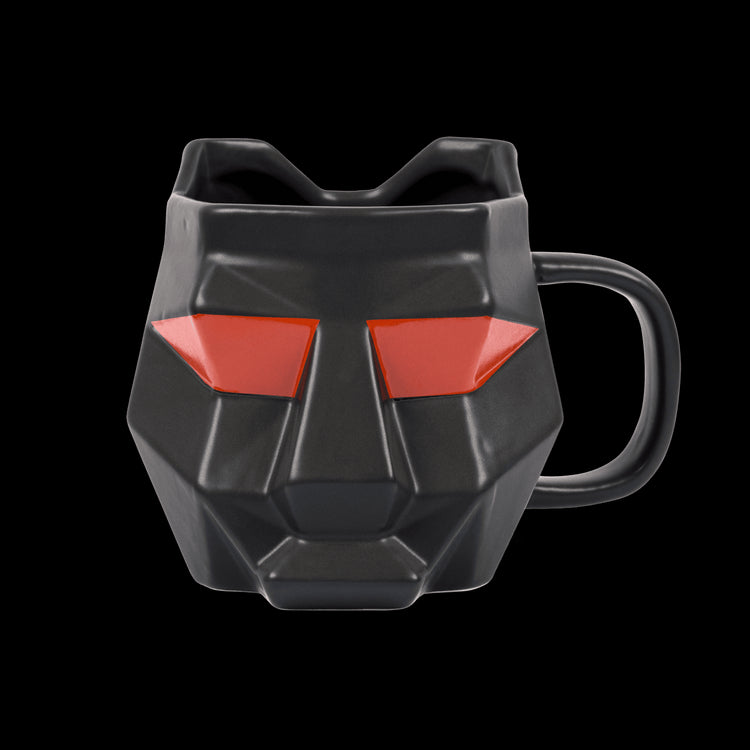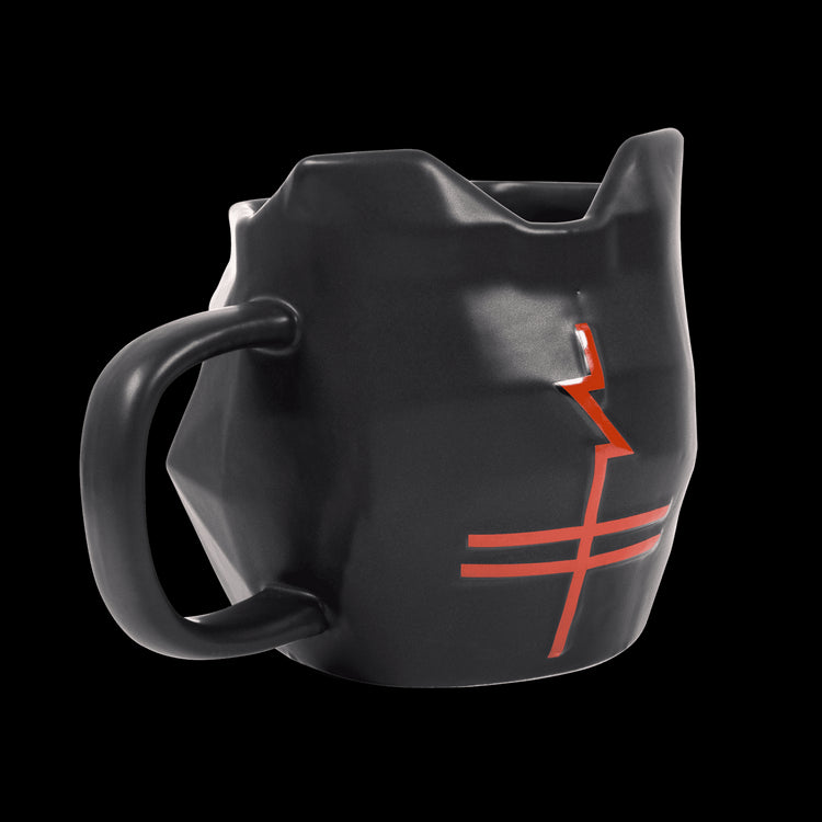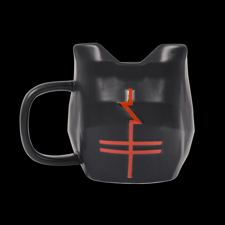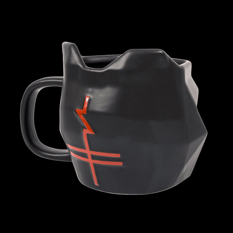 Black ceramic mug featuring red tiger helmet eyes and a red community cross on the back.