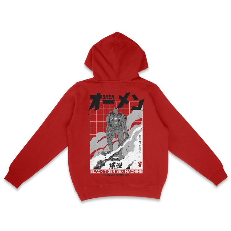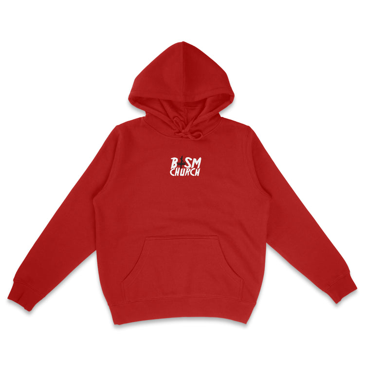 Premium quality 8.5oz mid-weight red pullover hoodie with front kangaroo pocket.